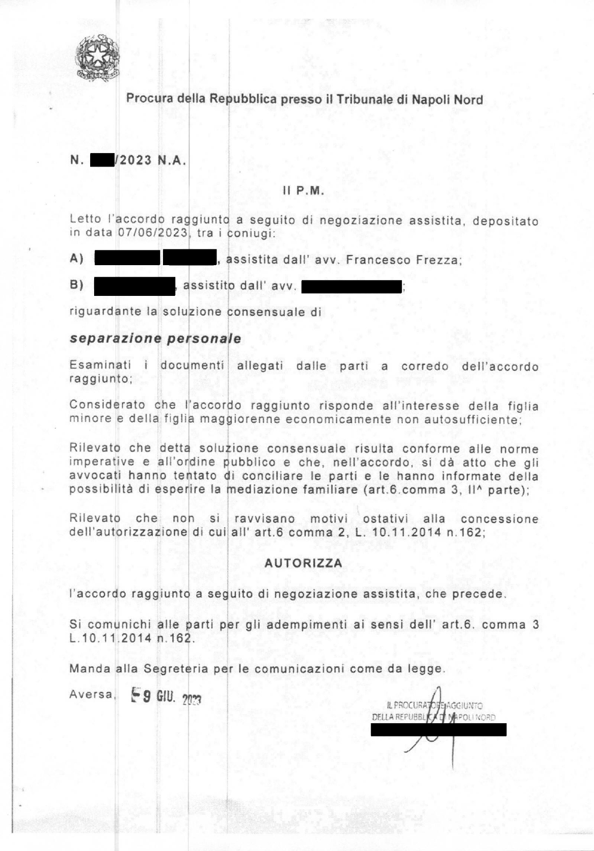 09/06/2023 provvedimento di autorizzazione all’accordo di separazione raggiunto.