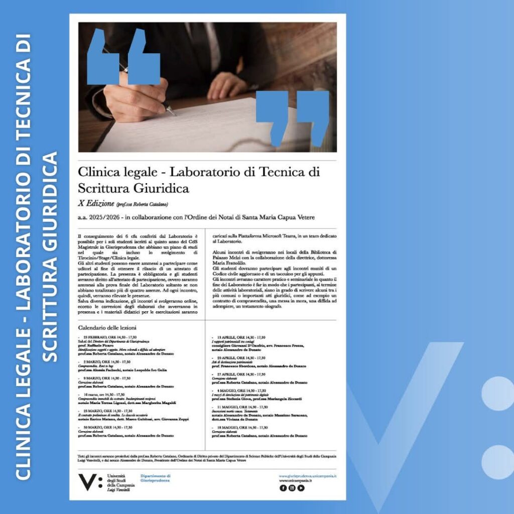 Il prossimo 13 aprile alle ore 14:30, l’avv. Francesco Frezza interverrà in qualità di relatore alla X Edizione della Clinica Legale — Laboratorio di Tecnica di Scrittura Giuridica, organizzata dall’Università degli Studi della Campania “Luigi Vanvitelli” in collaborazione con l’Ordine dei Notai di Santa Maria Capua Vetere.